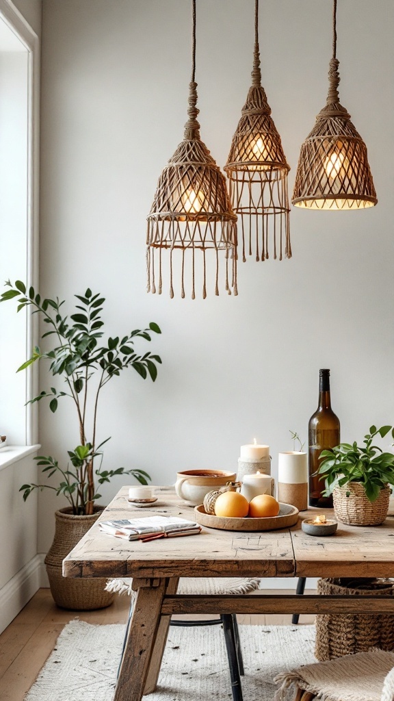 Three macrame pendants are shown in the photo, suspended over an old-fashioned wooden table. The woven patterns of the macrame pendants complement the earthy hues of the space. The soft light from the bulbs creates an inviting atmosphere, perfect for cozy evenings or gatherings. Mix them with natural décor and flowers to create a harmonious look.