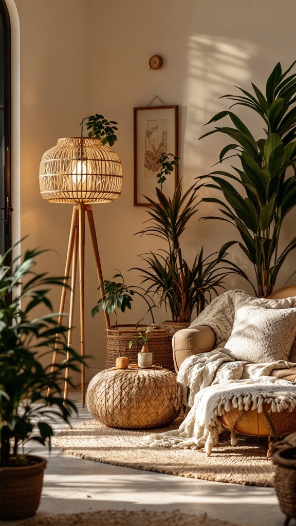 Rattan lamps are a wonderful accessory to any boho-inspired space. The image below illustrates a lamp that has an elegant design that adds warmth to the room. The natural look and soft light make a warm and inviting ambience.