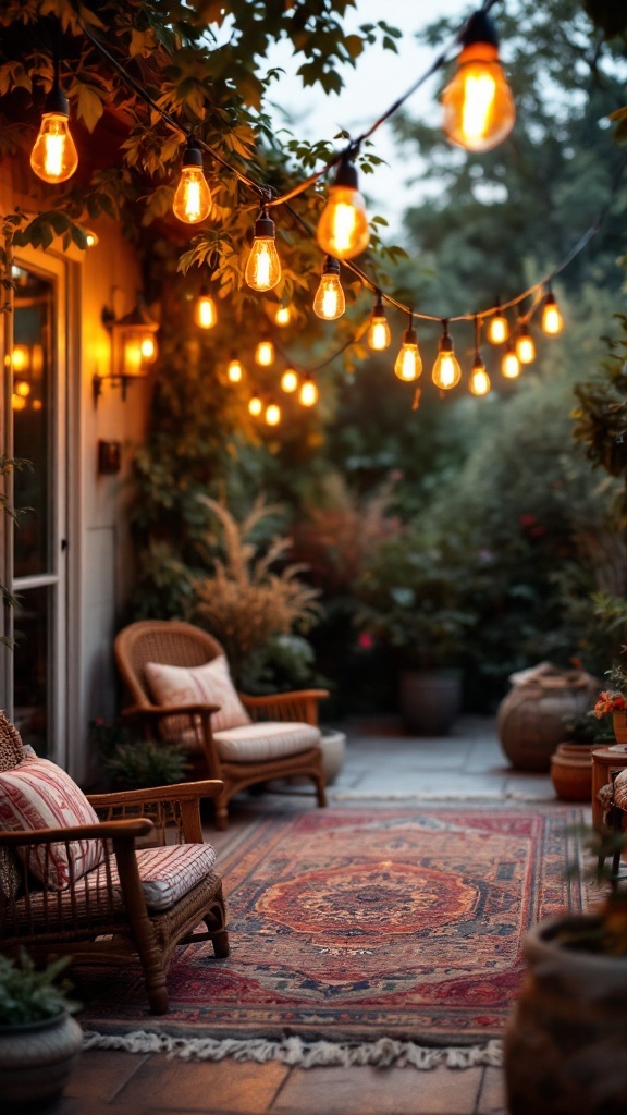 The photo shows a stunning patio that has been decorated with these string lights. The lights hang elegantly in a lush, green space. This arrangement invites chatter and relaxation. Imagine sipping your favorite drink under this enchanting lighting!
